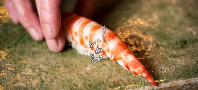 旬の味覚を少しずつ、つまみと握り、時おり串揚げを交えた全23品の少量多皿のおまかせをご堪能いただけます。鮨を軸にしながら、ふと訪れる串揚げの遊び心こそが“海老虎流”。